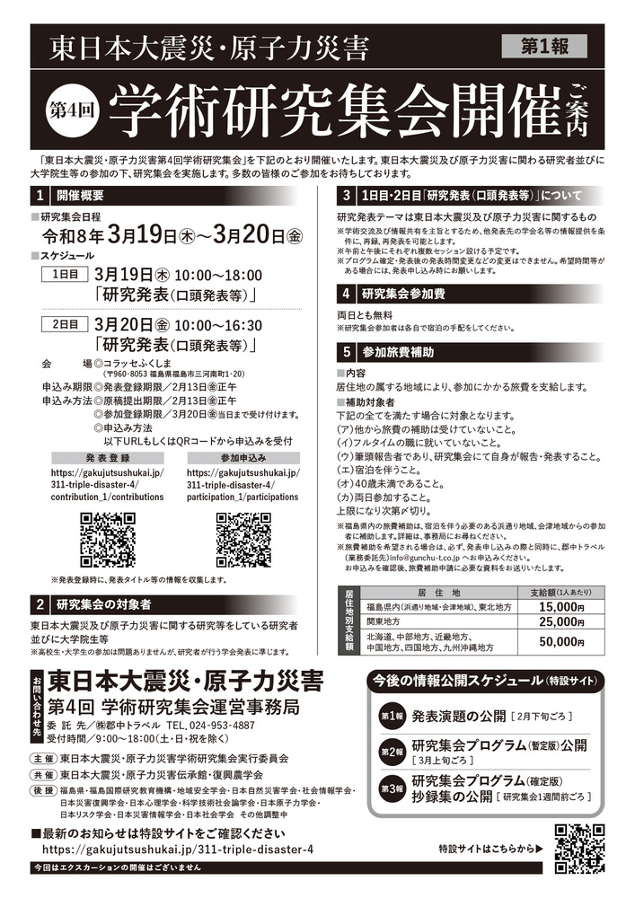 東日本大震災及び原子力災害に関わる研究者等の参加の下、「各研究活動の発表」を含めた「東日本大震災・原子力災害 第4回 学術研究集会」を実施します。